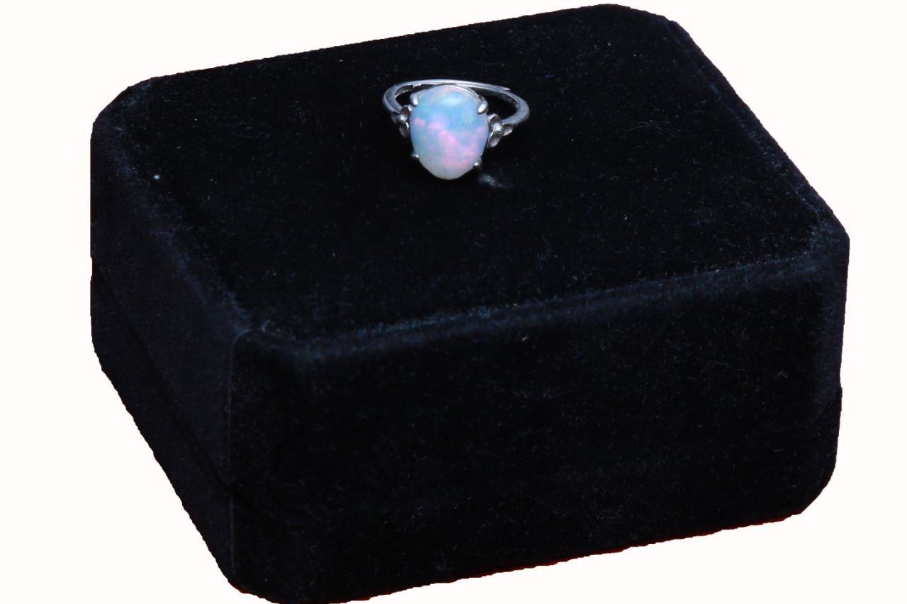 - This rings features a captivating oval-cut opal set in an elegant silver band. The opal showcases a beautiful play of color, with flashes of green, pink, and orange visible under the light—a hallmark of high-quality opals. The setting is crafted from polished silver (925), with delicate, nature-inspired prongs and filigree work that gracefully wrap around the stone, securing it while adding an artistic touch.